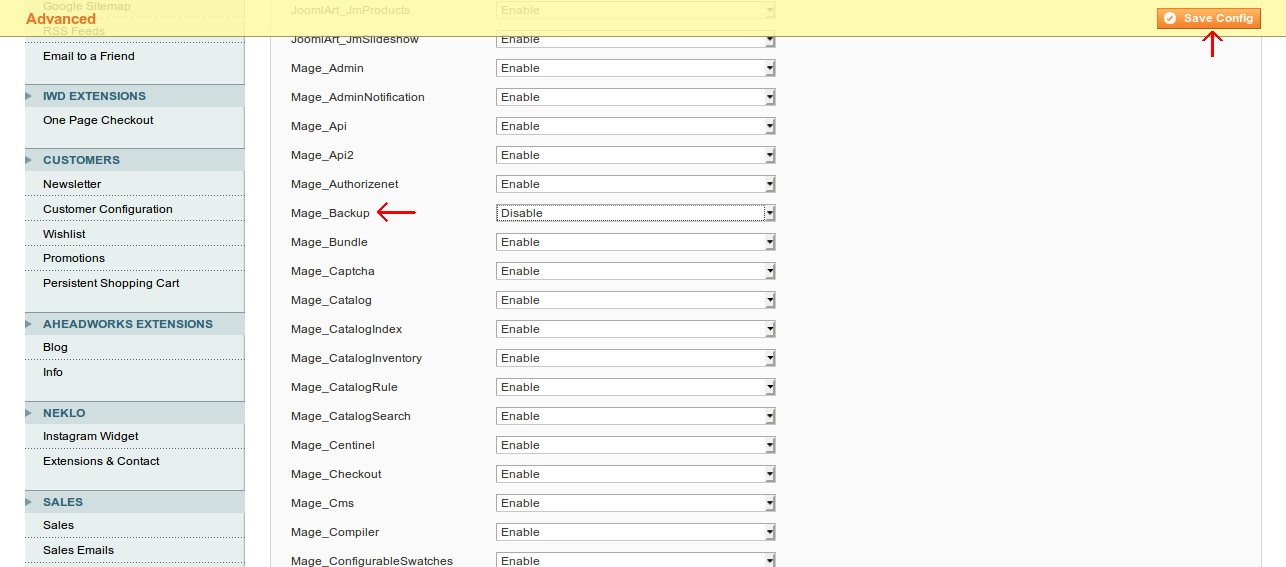 On the "DISABLE MODULES OUTPUT" page scroll down until you see "MAGE_BACKUP"